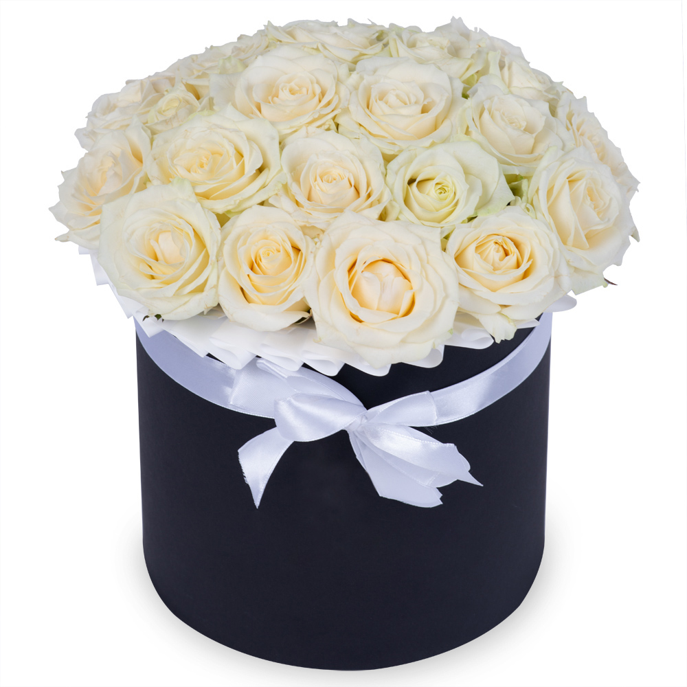Букет из 25 белых роз premium в черной шляпной коробке
