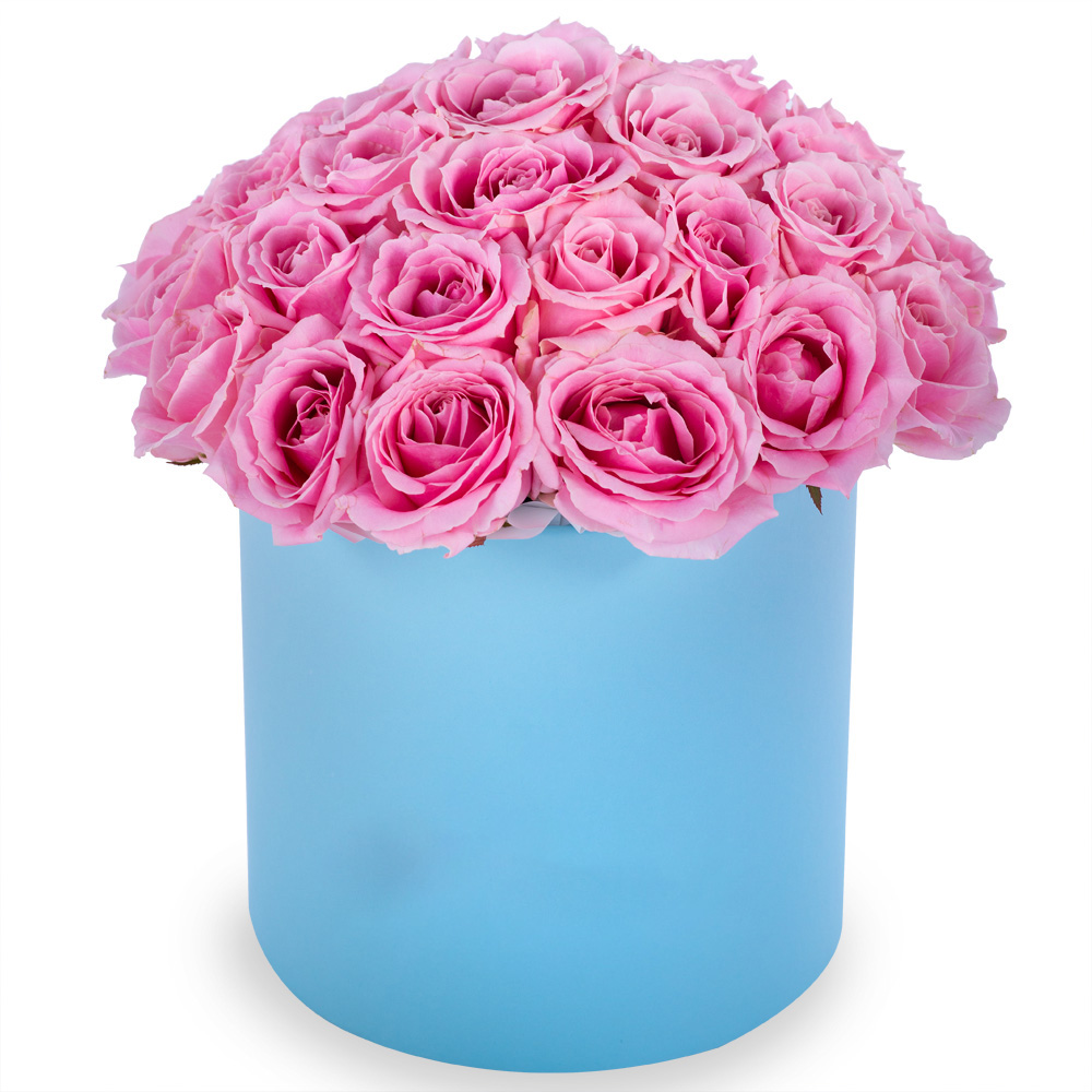 Букет из 35 розовых роз premium в голубой шляпной коробке
