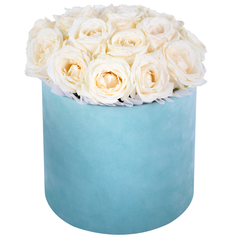 Букет из 19 белых роз premium в зеленой бархатной шляпной коробке