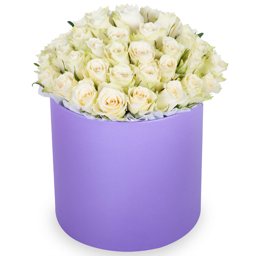 Букет из 75 белых роз в фиолетовой шляпной коробке