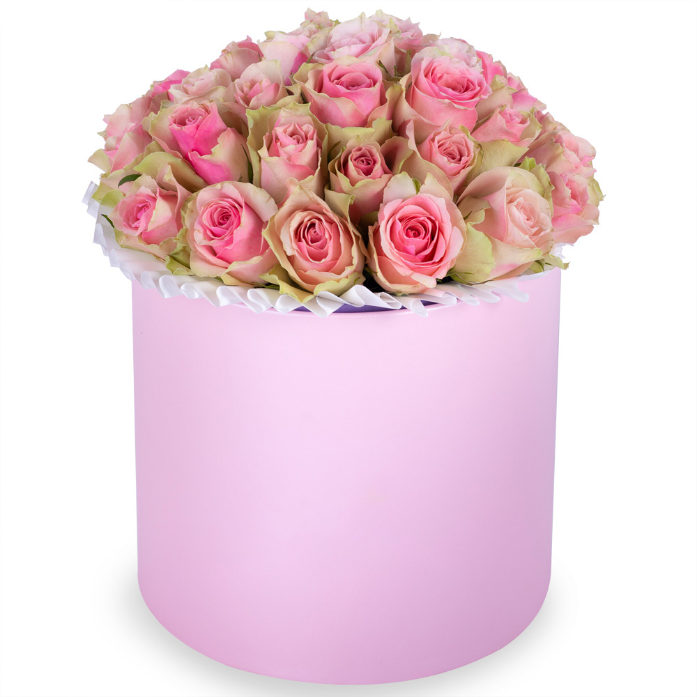 Букет из 25 бело-розовых роз в розовой шляпной коробке