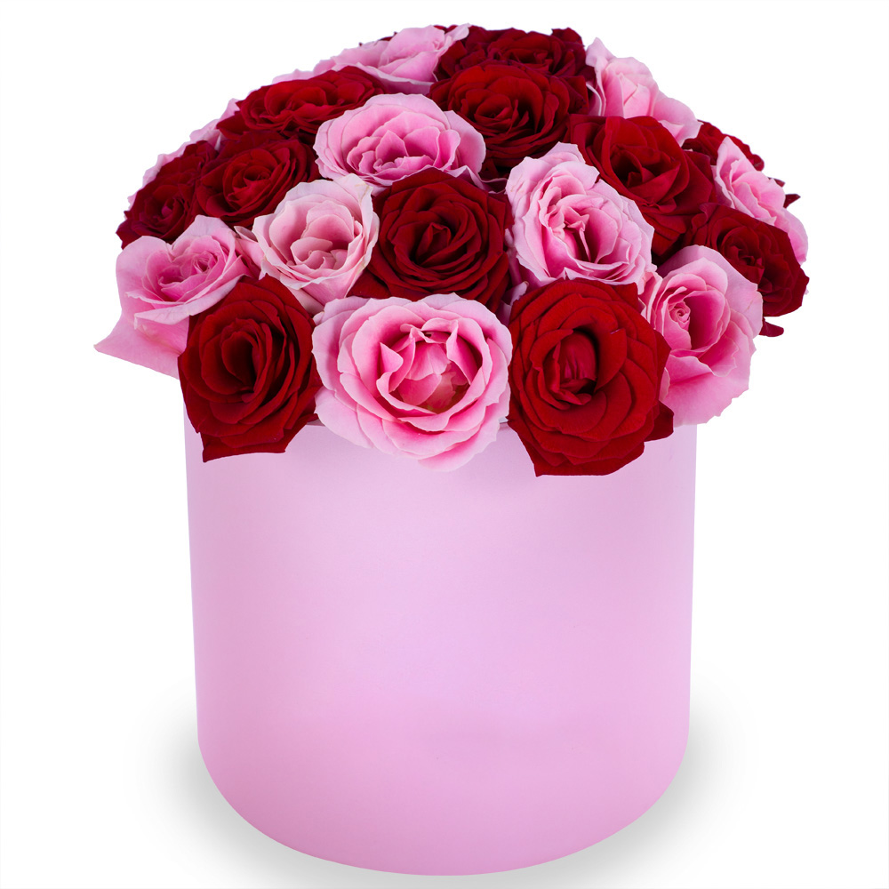 Букет из 35 разноцветных роз premium в розовой шляпной коробке