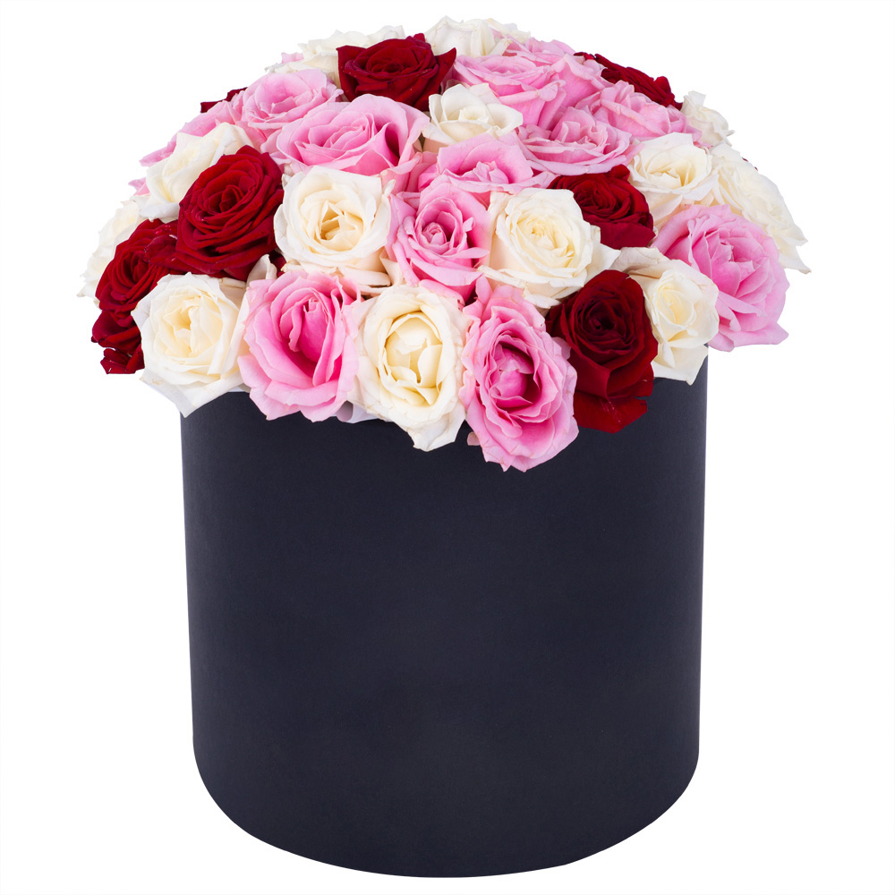 Букет из 51 разноцветной розы premium в черной шляпной коробке