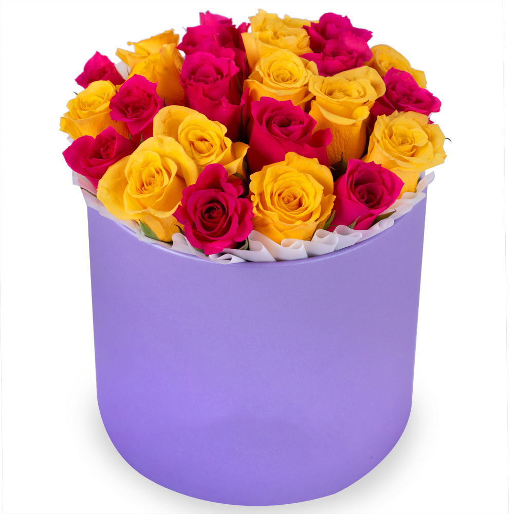 25 разноцветных роз в фиолетовой шляпной коробке