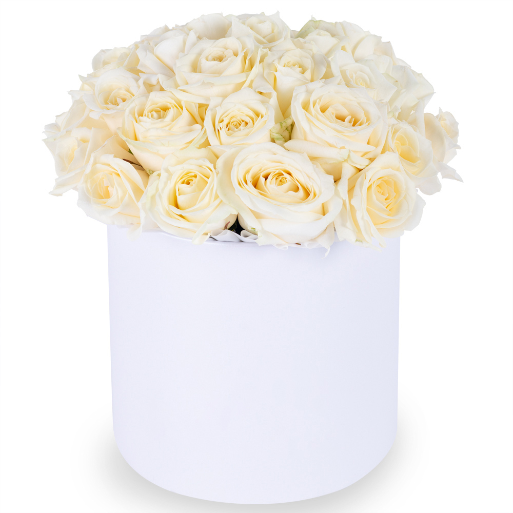 Букет из 35 белых роз premium в кремовой шляпной коробке