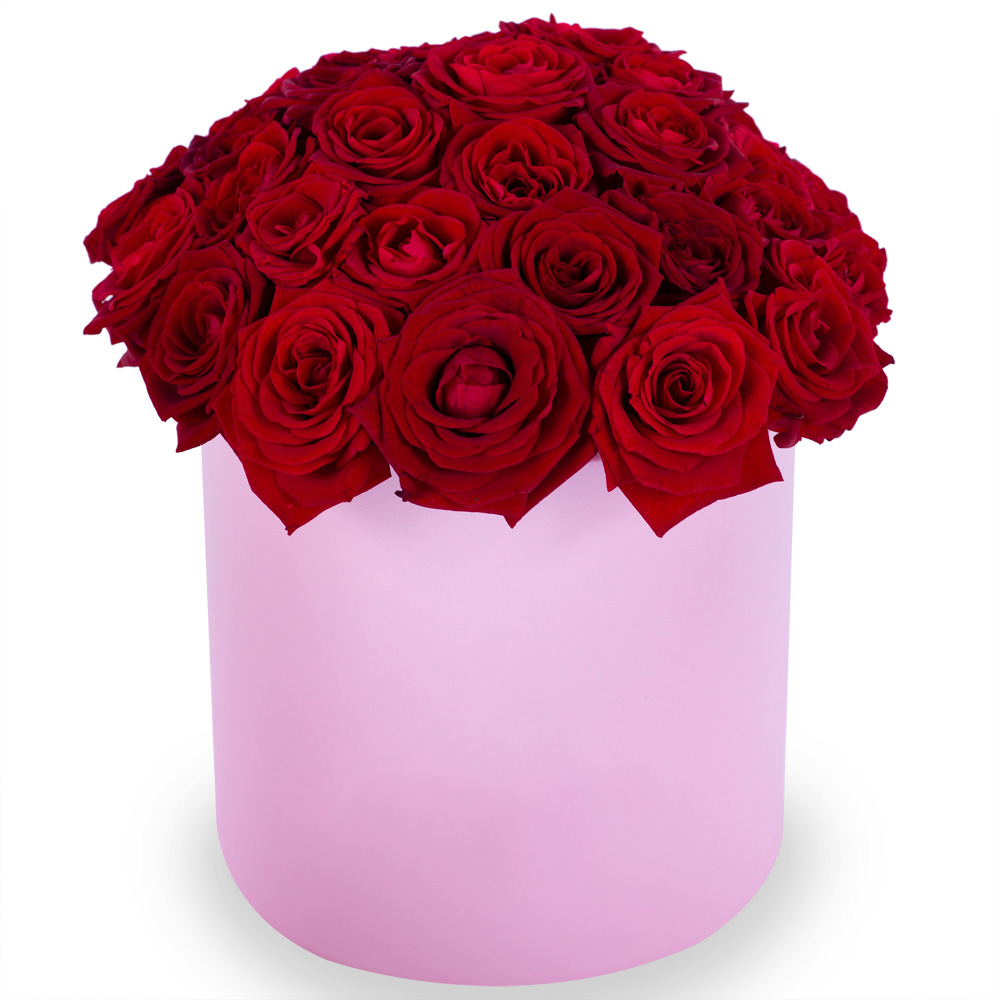 Букет из 35 красных роз premium в розовой шляпной коробке