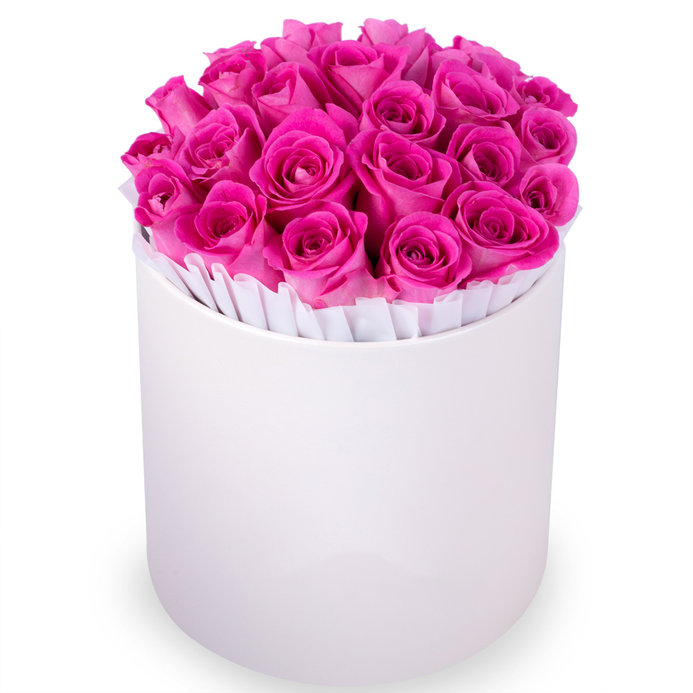 25 розовых роз в кремовой шляпной коробке