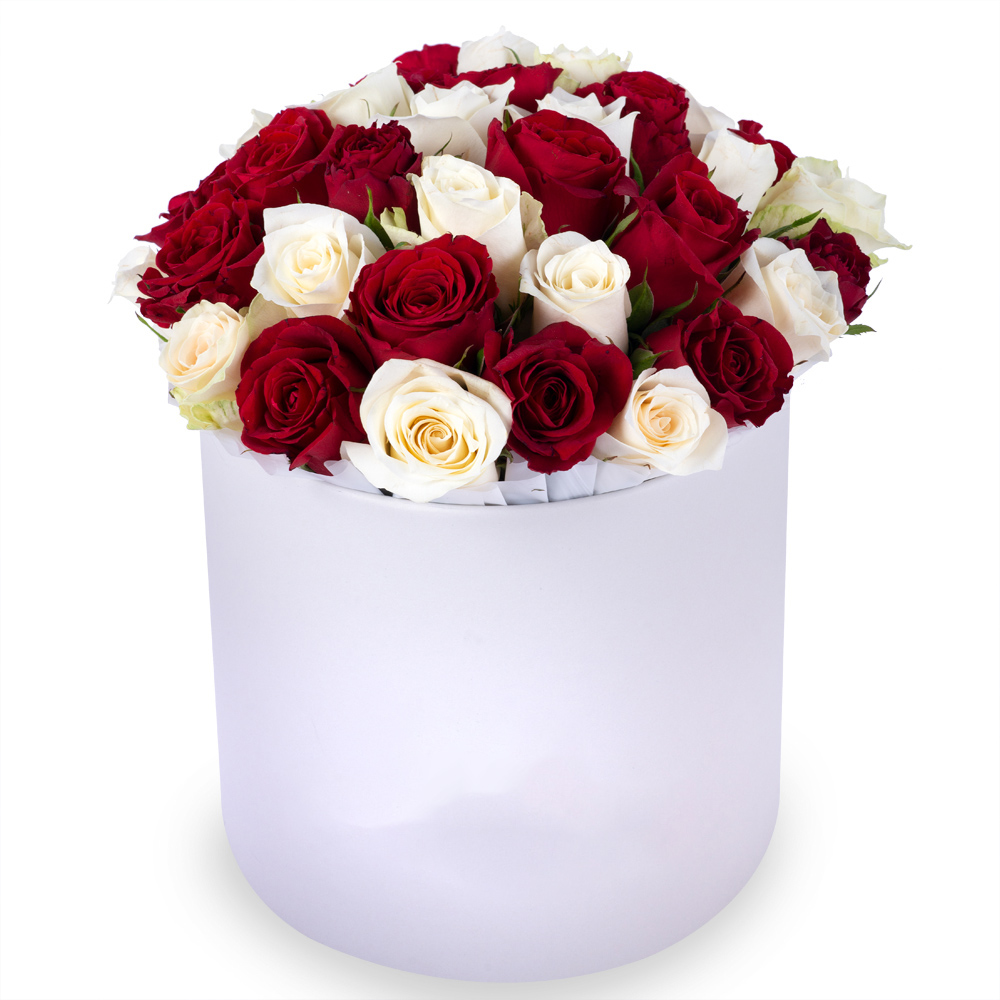35 разноцветных роз в белой шляпной коробке