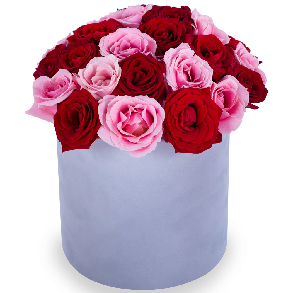 Букет из 35 разноцветных роз premium в серой бархатной шляпной коробке