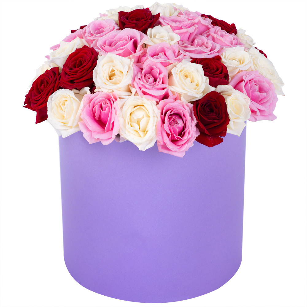 Букет из 51 разноцветной розы premium в фиолетовой шляпной коробке