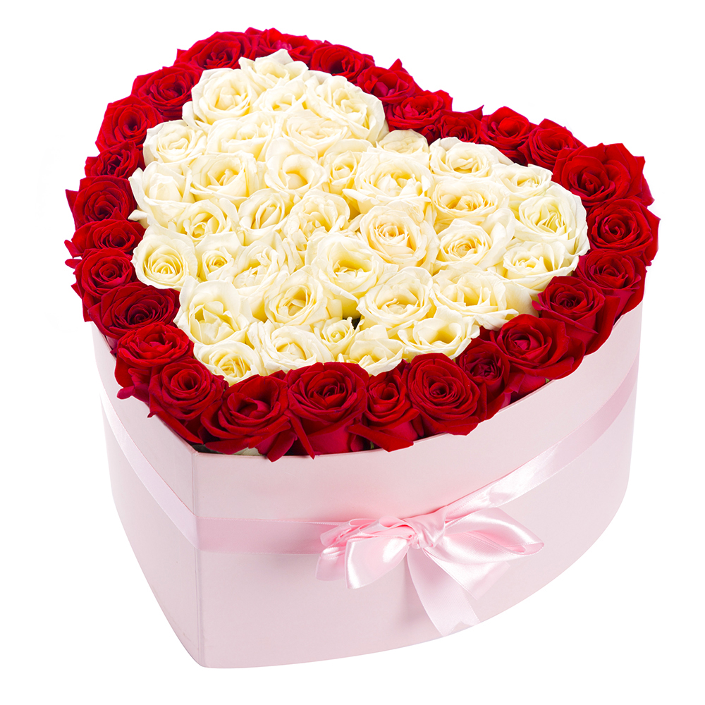51 красная и белая роза в коробке в форме сердца
