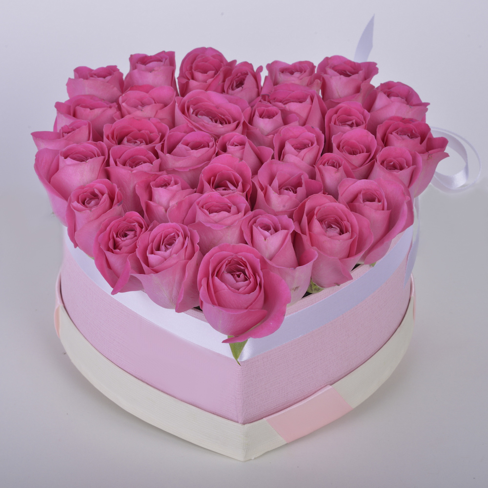 35 розовых роз в коробки в форме сердца