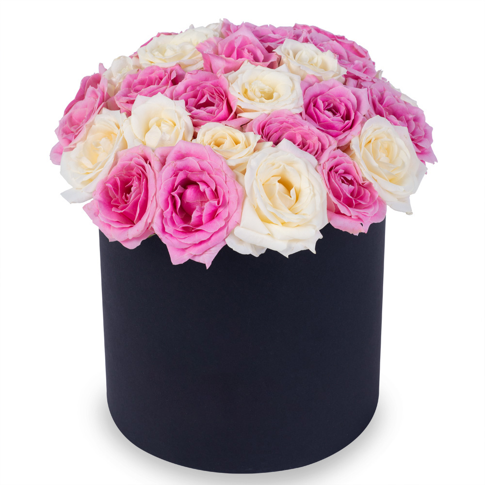 25 разноцветных роз premium в черной шляпной коробке