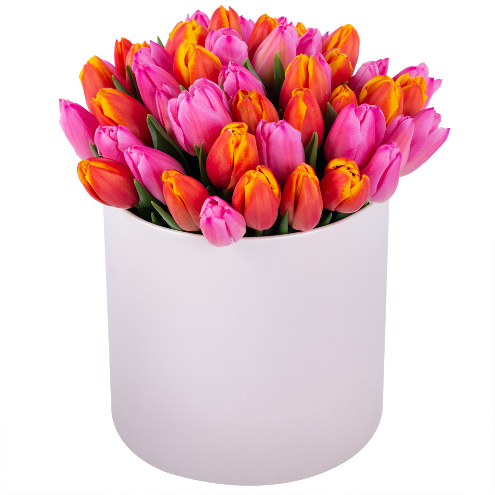 Букет микс из 51 тюльпана в кремовой шляпной коробке