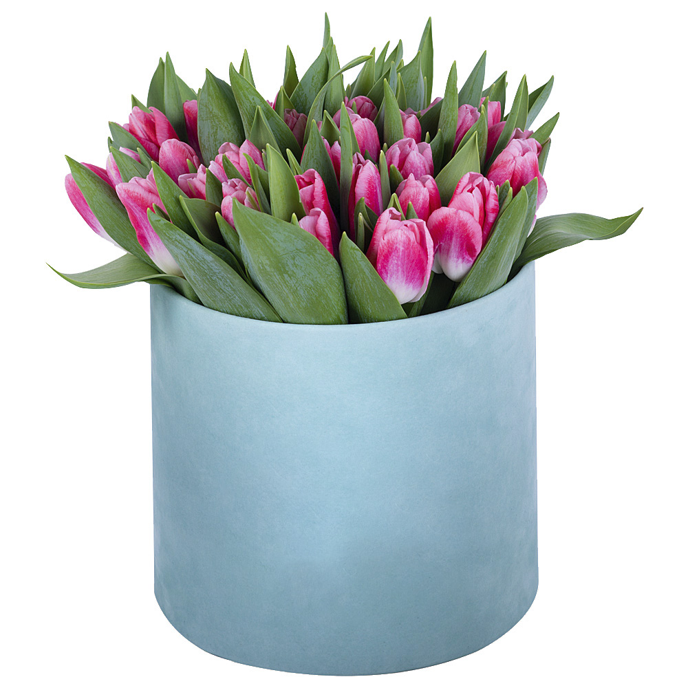 51 Бело-малиновый тюльпан в зеленой бархатной шляпной коробке