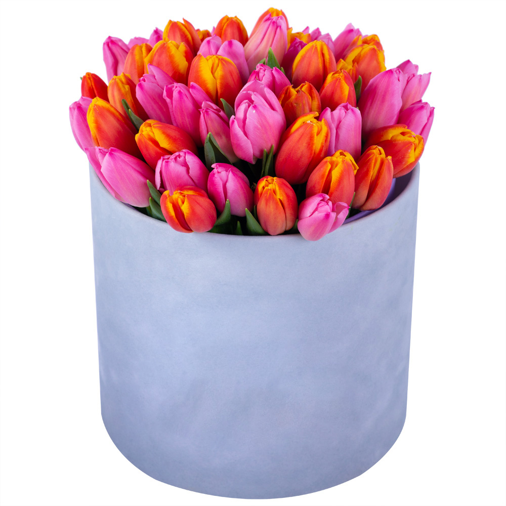 Букет микс из 51 тюльпана в серой бархатной шляпной коробке