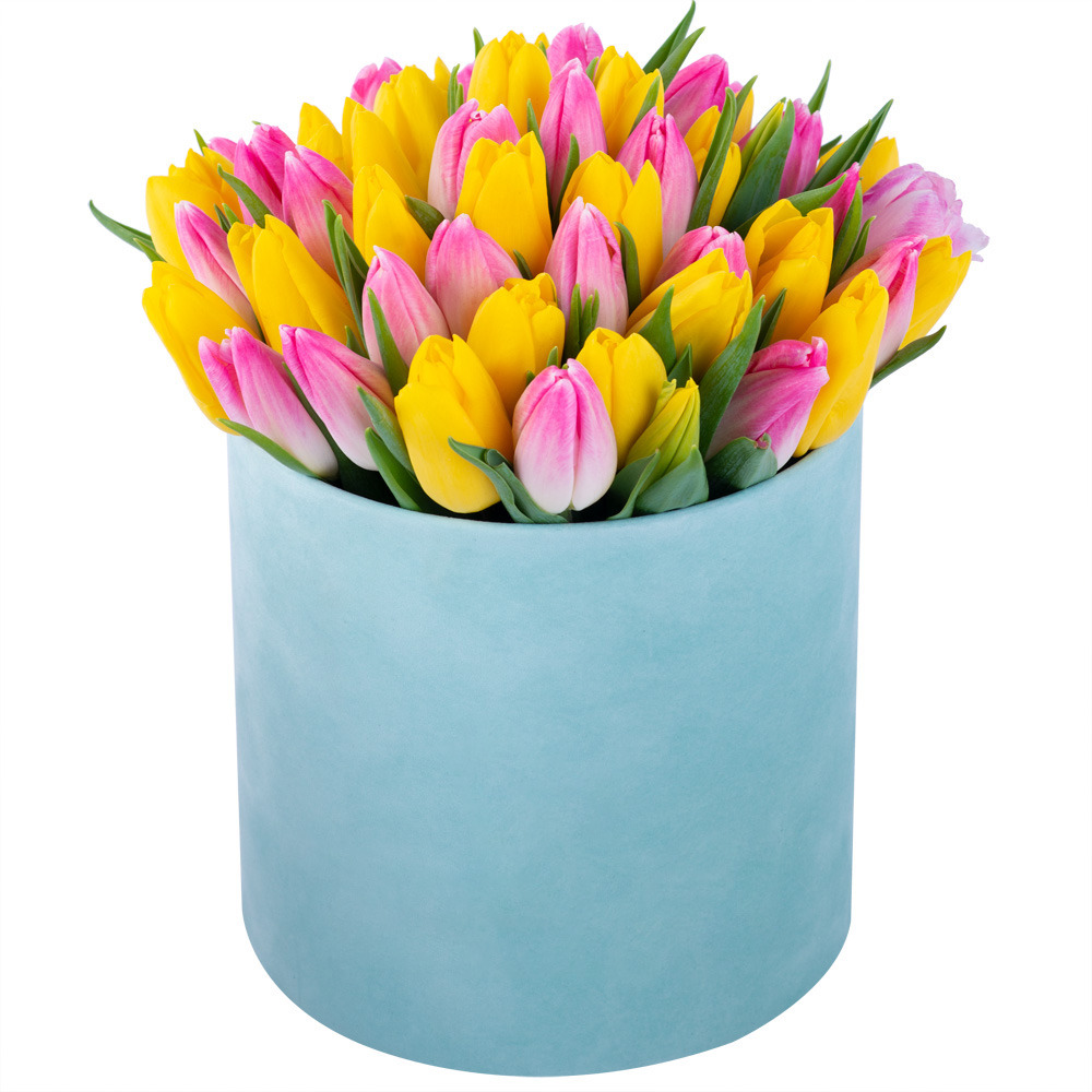 51 разноцветных тюльпан в зеленой бархатной шляпной коробке