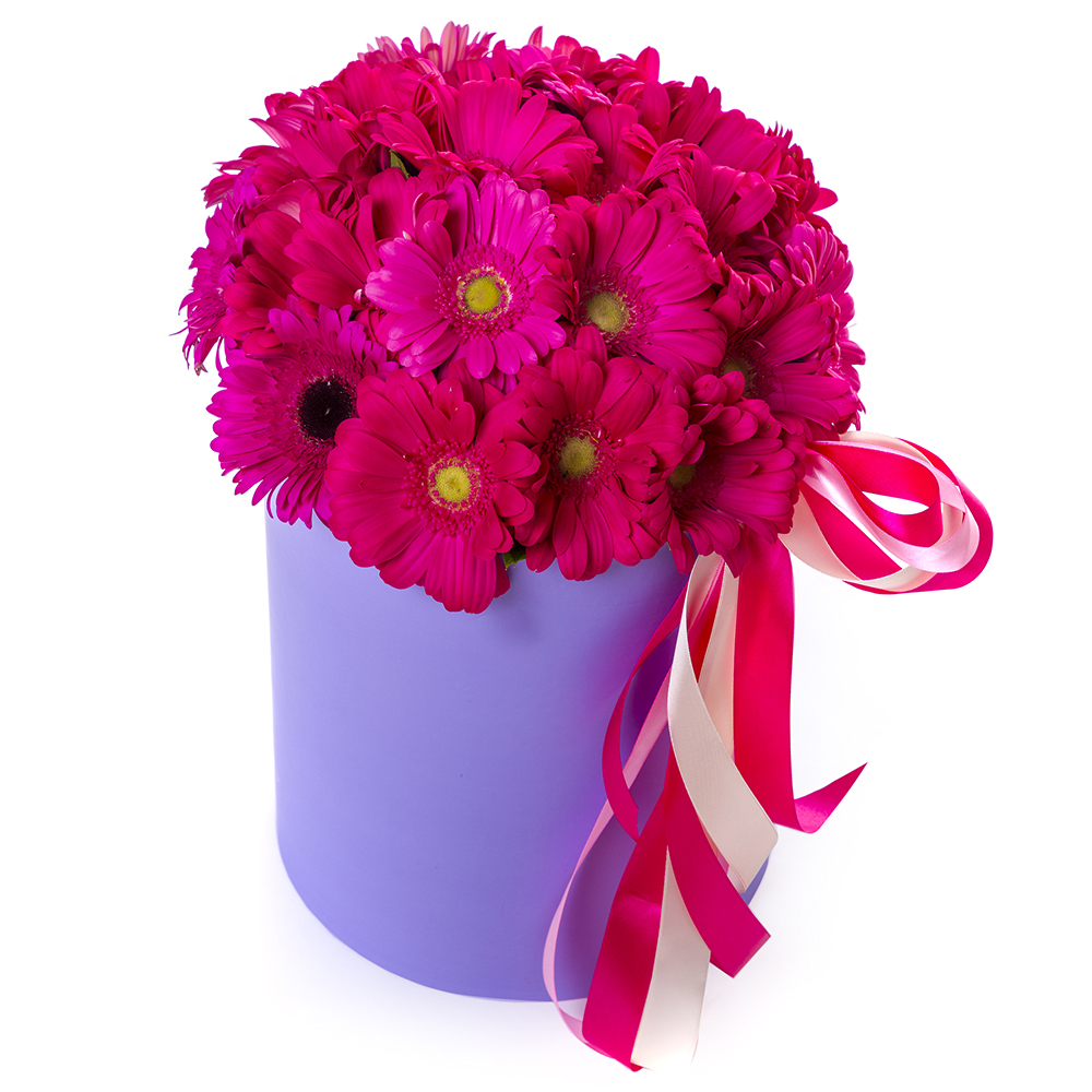 25 малиновых гербер в шляпной коробке