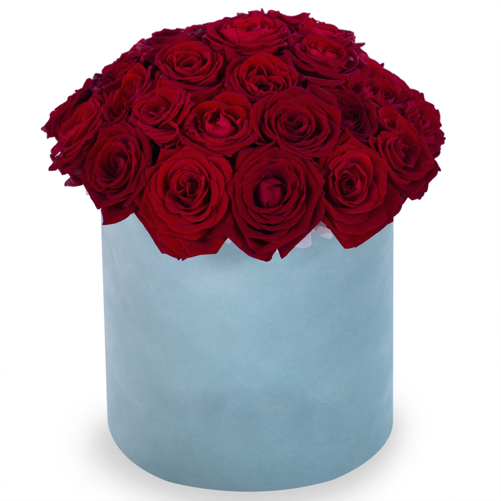 Букет из 35 красных роз premium в зеленой бархатной шляпной коробке