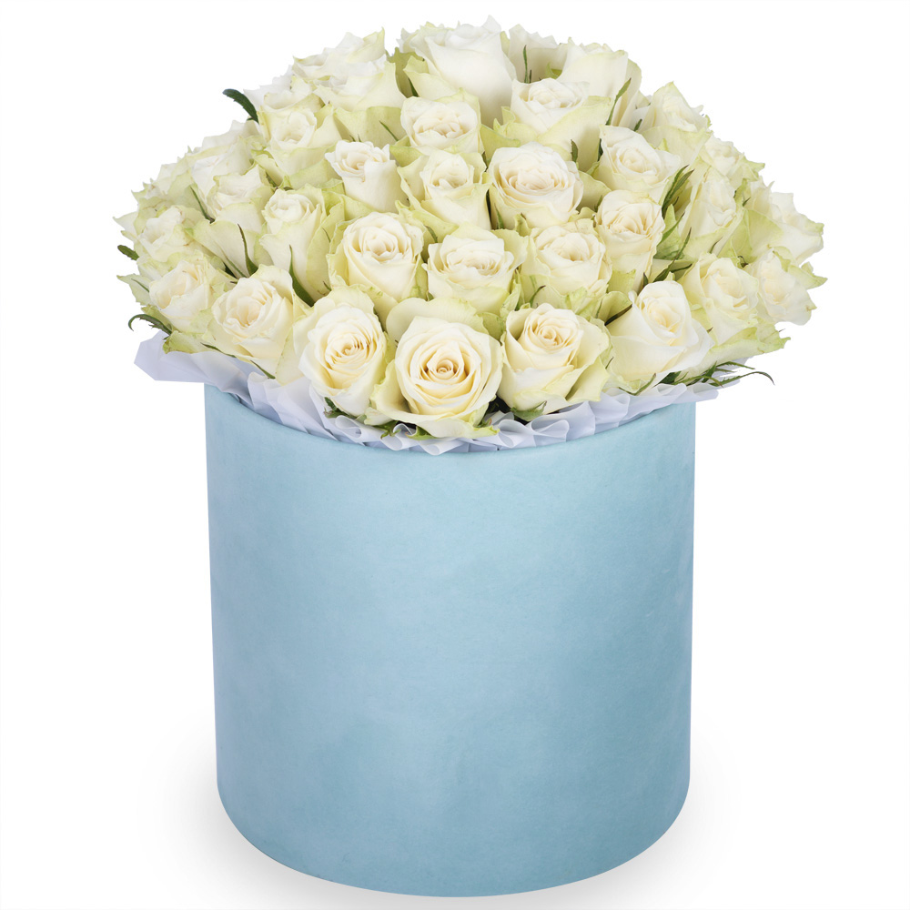 Букет из 75 белых роз в зеленой бархатной шляпной коробке