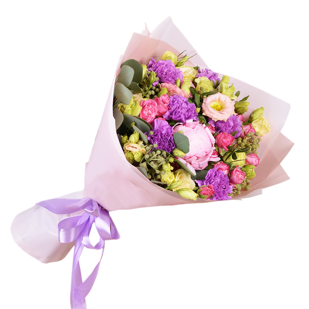 Букет из пиона, гвоздик и кустовых роз