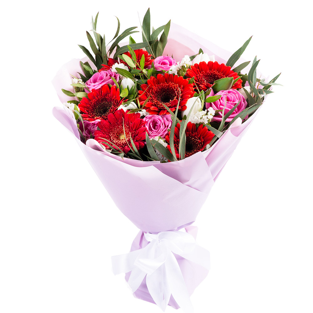 Букет из гербер, роз и эвкалипта