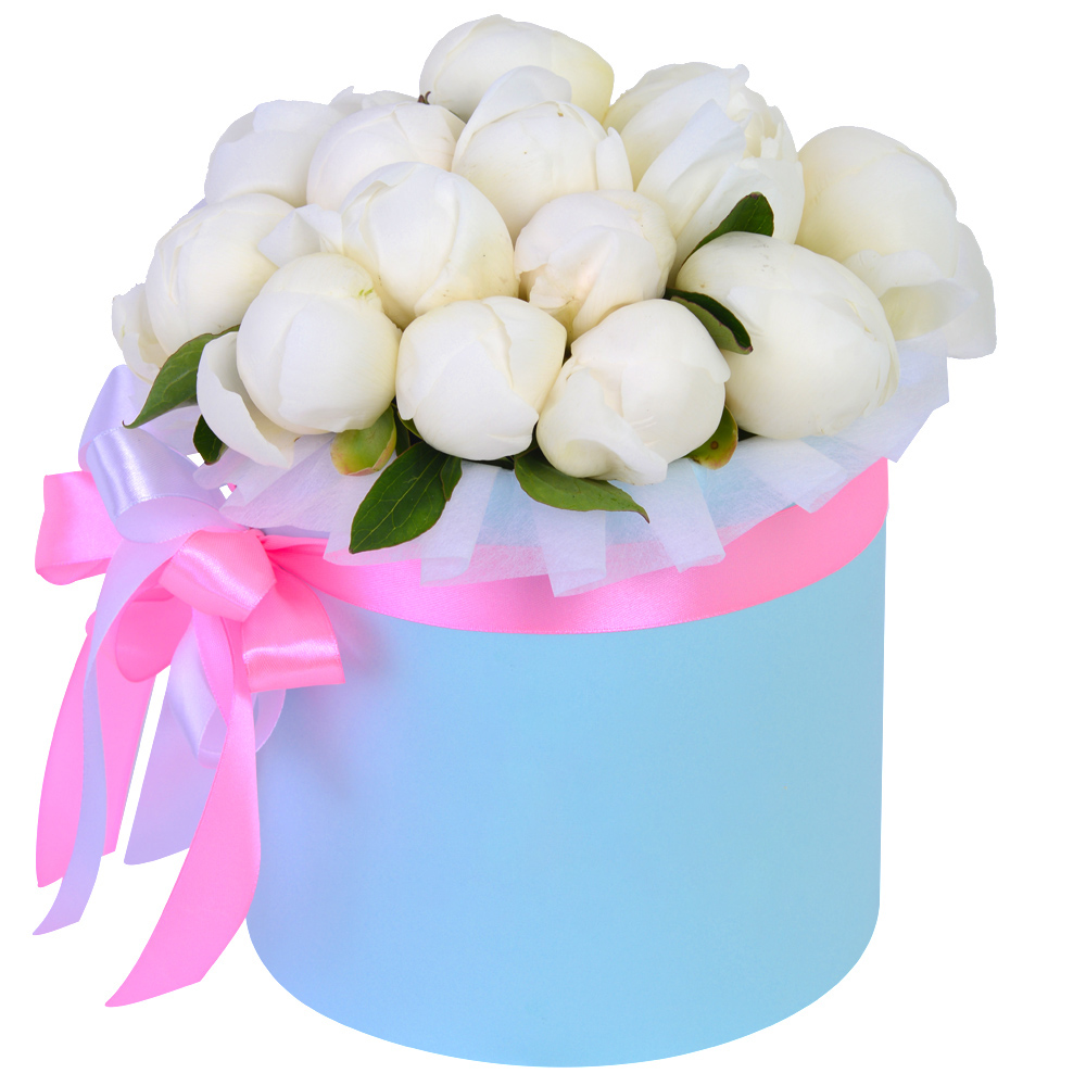 Букет из 15 белых пионов в голубой шляпной коробке