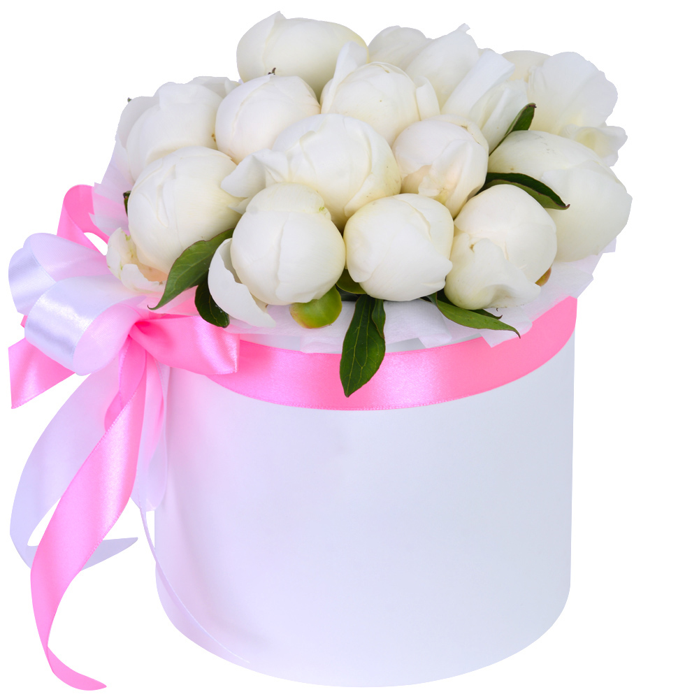 Букет из 15 белых пионов в белой шляпной коробке