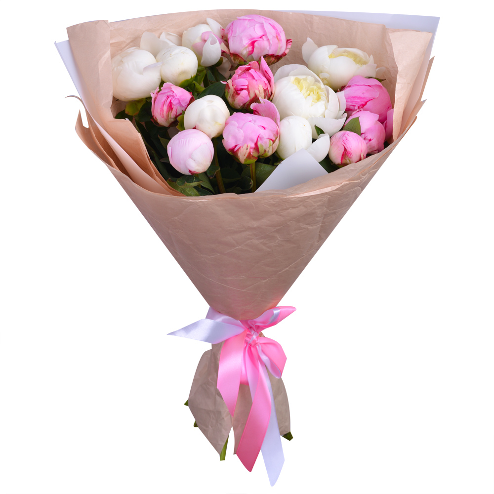 Букет из 15 разноцветных пионов