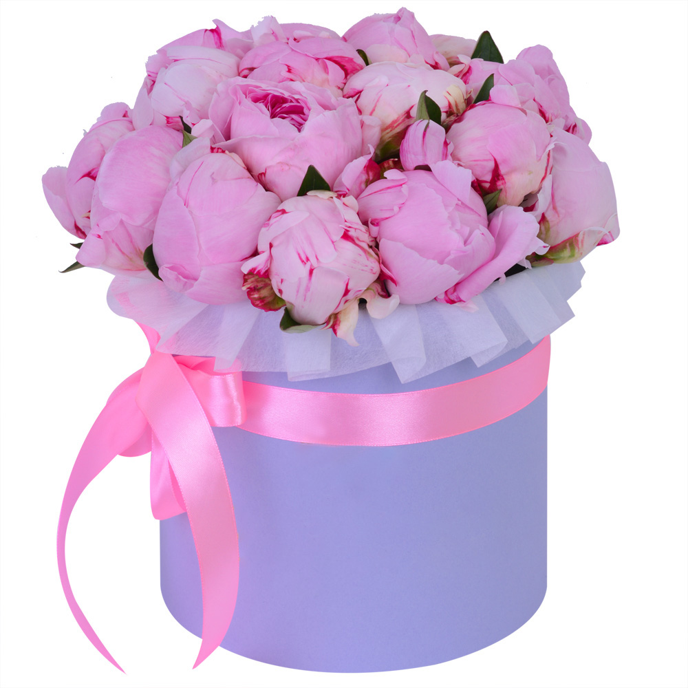 Букет из 19 розовых пионов в фиолетовой шляпной коробке
