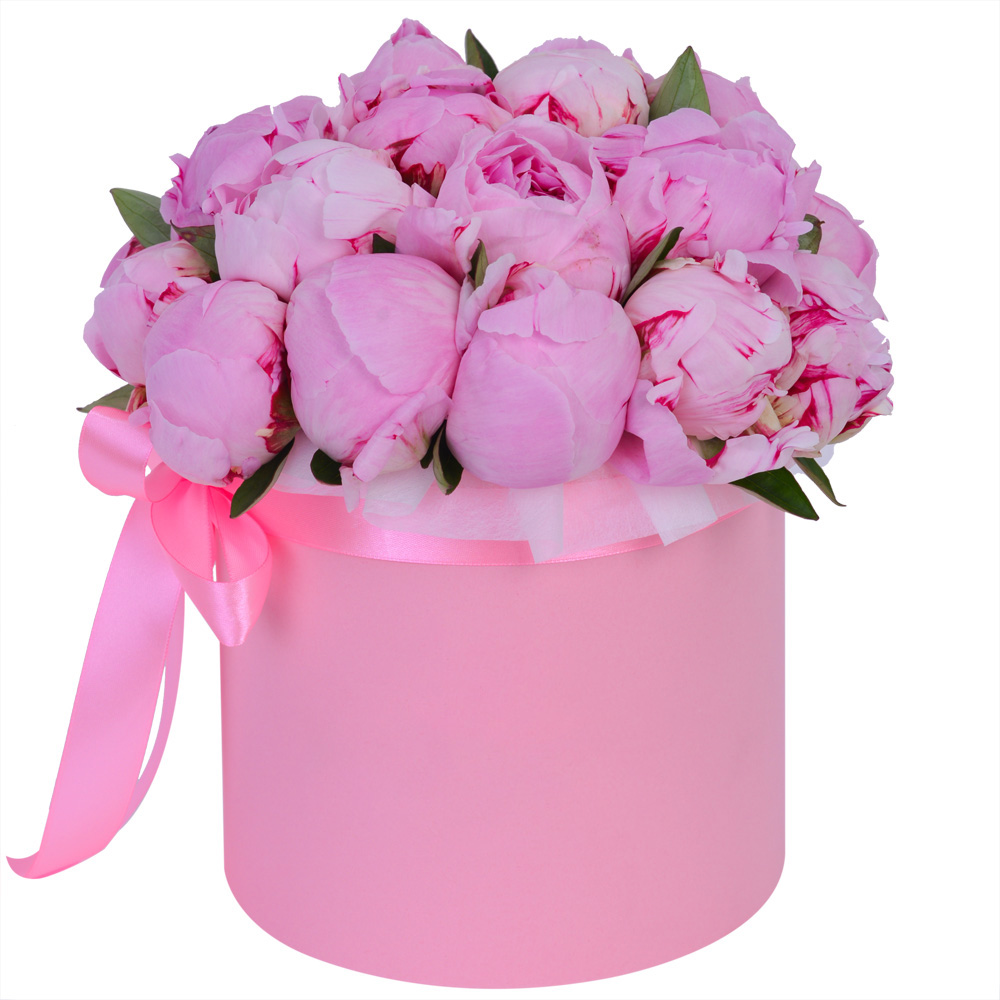 Букет из 21 розового пиона в розовой шляпной коробке