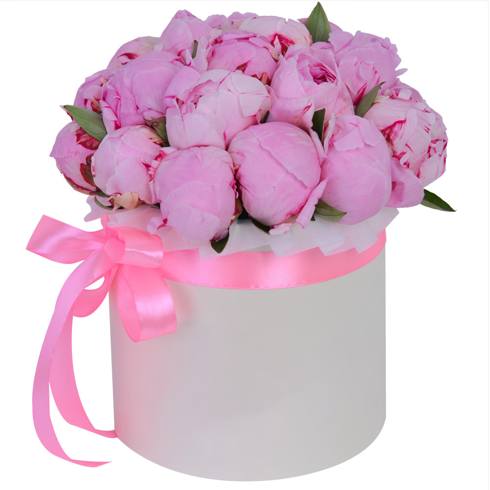 Букет из 21 розового пиона в кремовой шляпной коробке