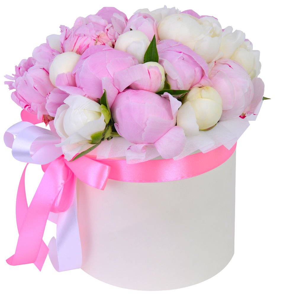 Букет из 21 разноцветного пиона в кремовой шляпной коробке