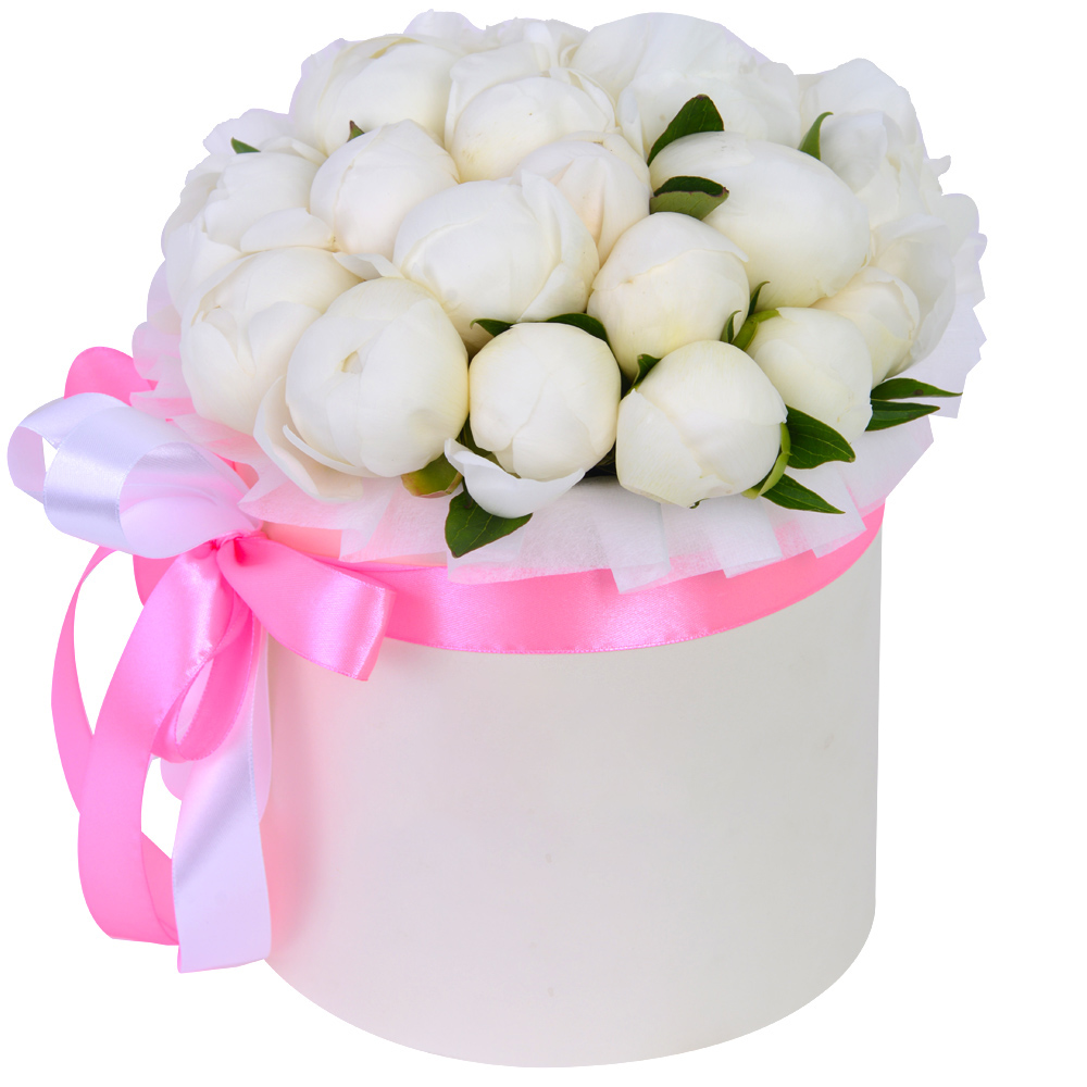 Букет из 21 белого пиона в кремовой шляпной коробке