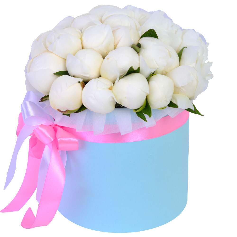 Букет из 25 белых пионов в голубой шляпной коробке