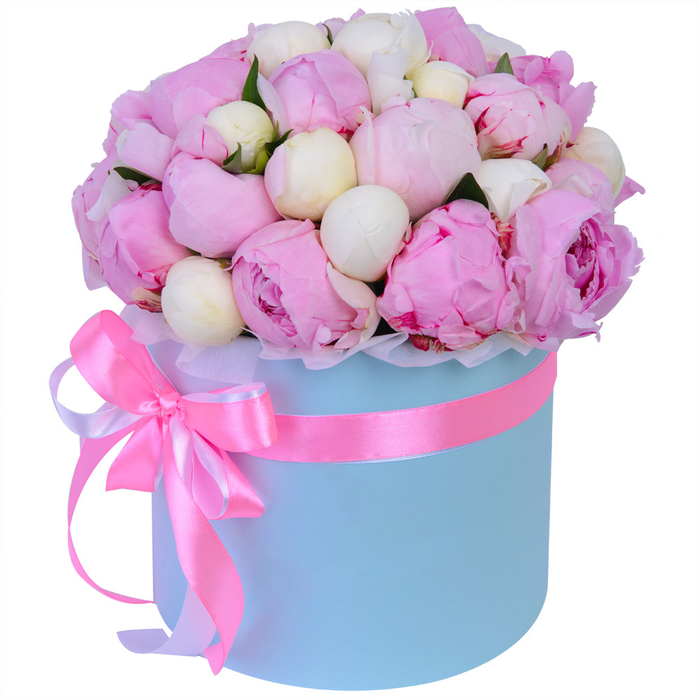 Букет из 35 разноцветных пионов в голубой шляпной коробке