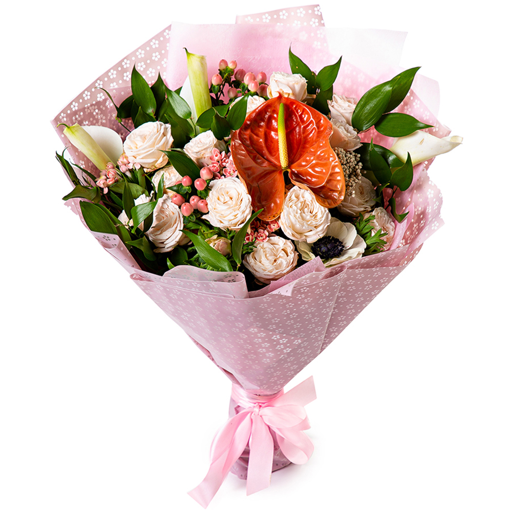 Букет с антуриумом, кустовыми розами и каллами