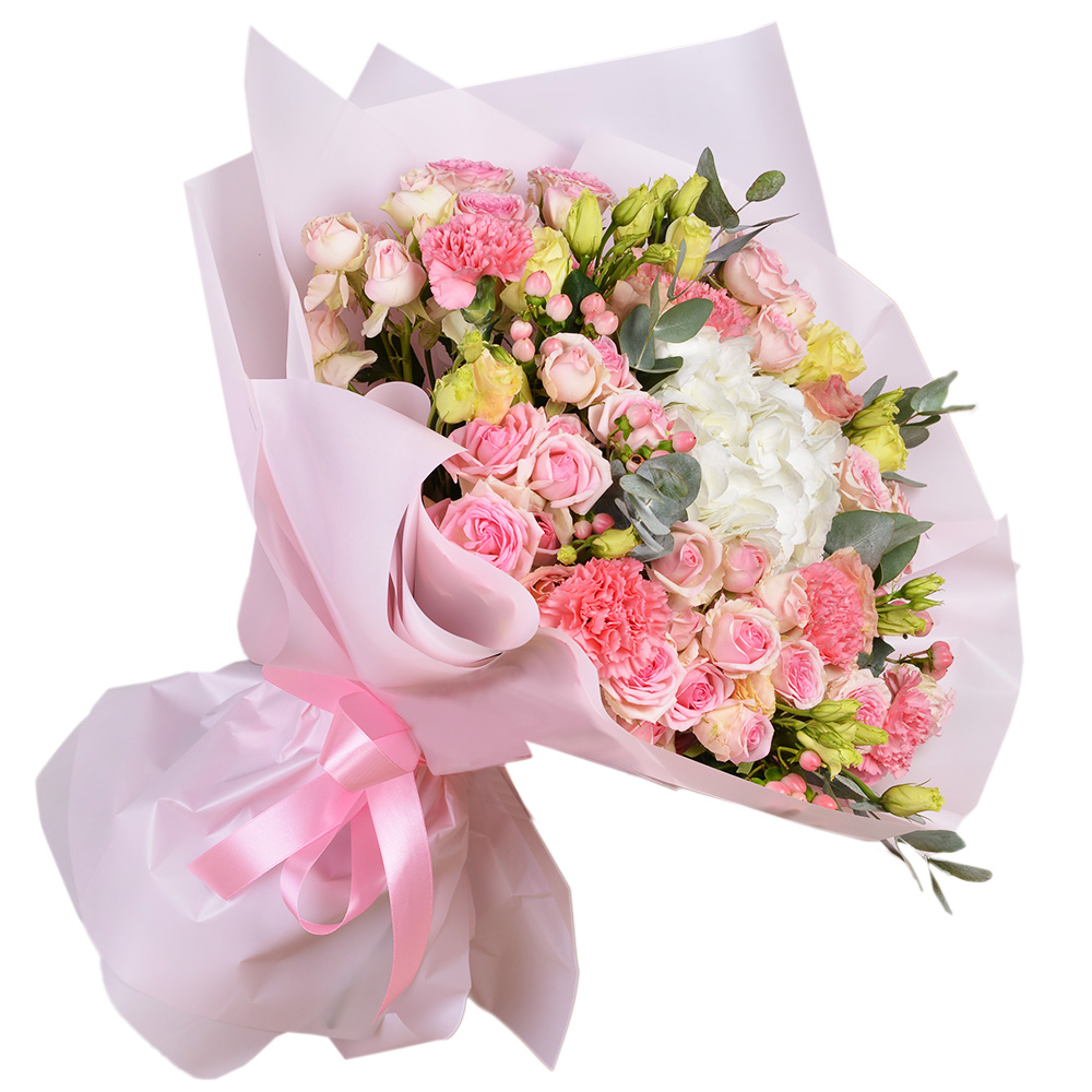 Букет из гортензии, гвоздик и кустовых роз