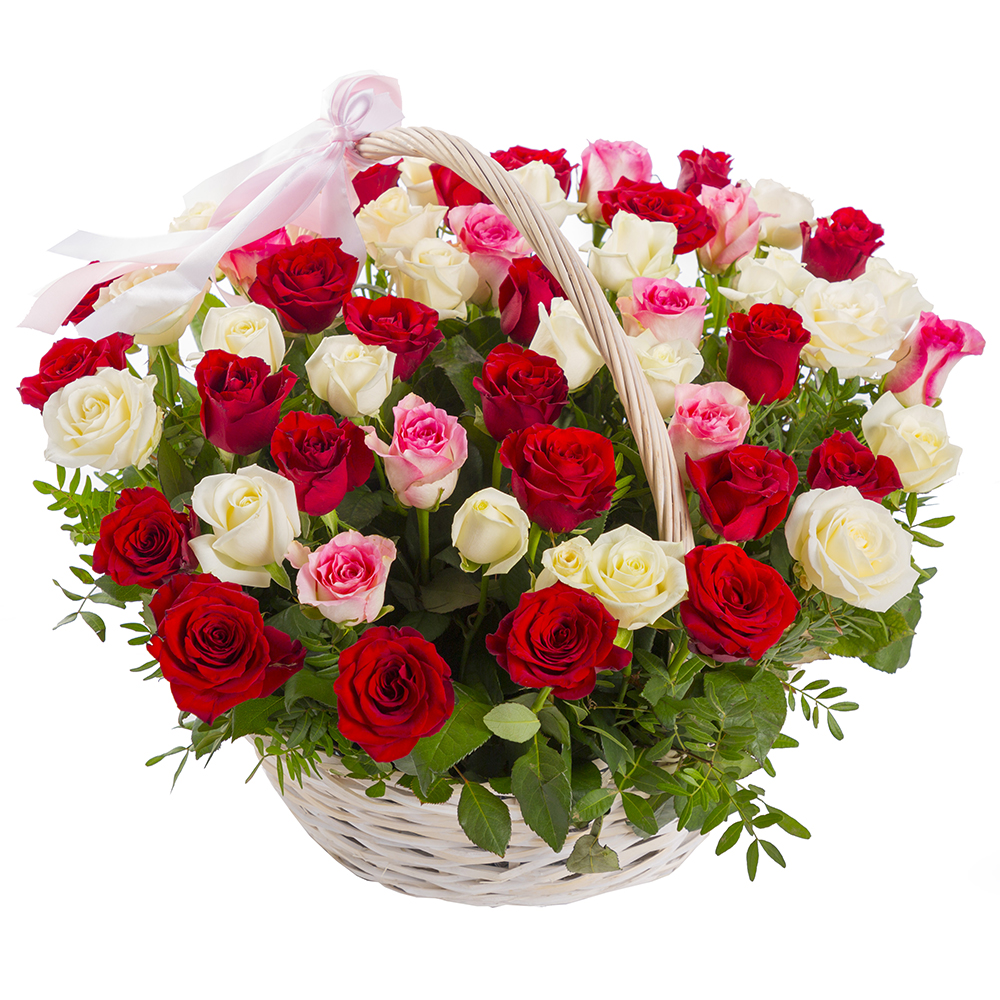 51 разноцветная роза в корзине