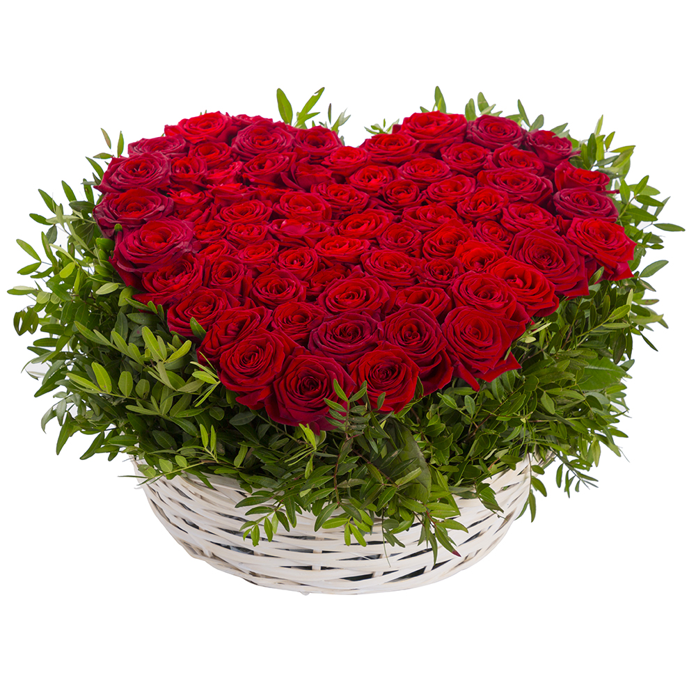 75 красная роза premium в форме сердца в корзине