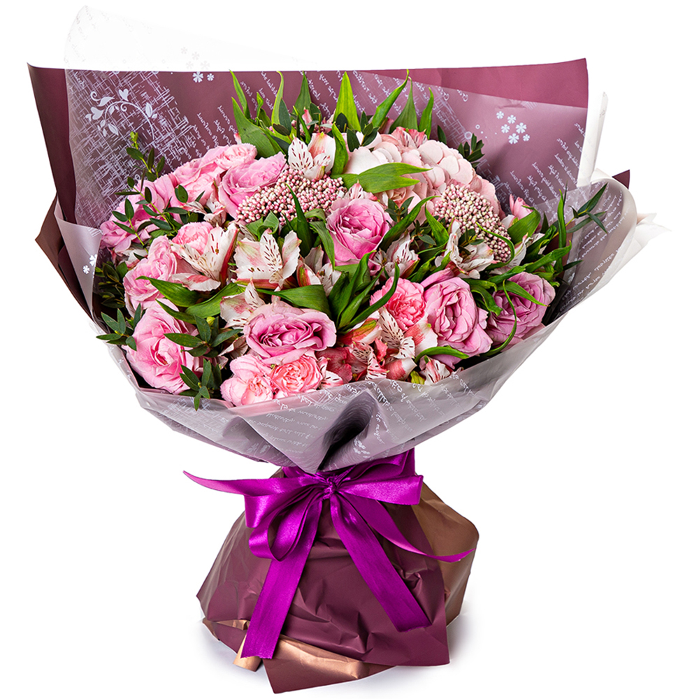 Букет с розами, диантусами и альстромериями