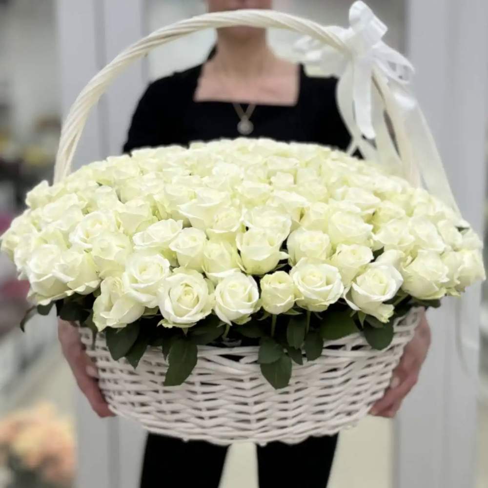 201 белая роза в корзине с лентой