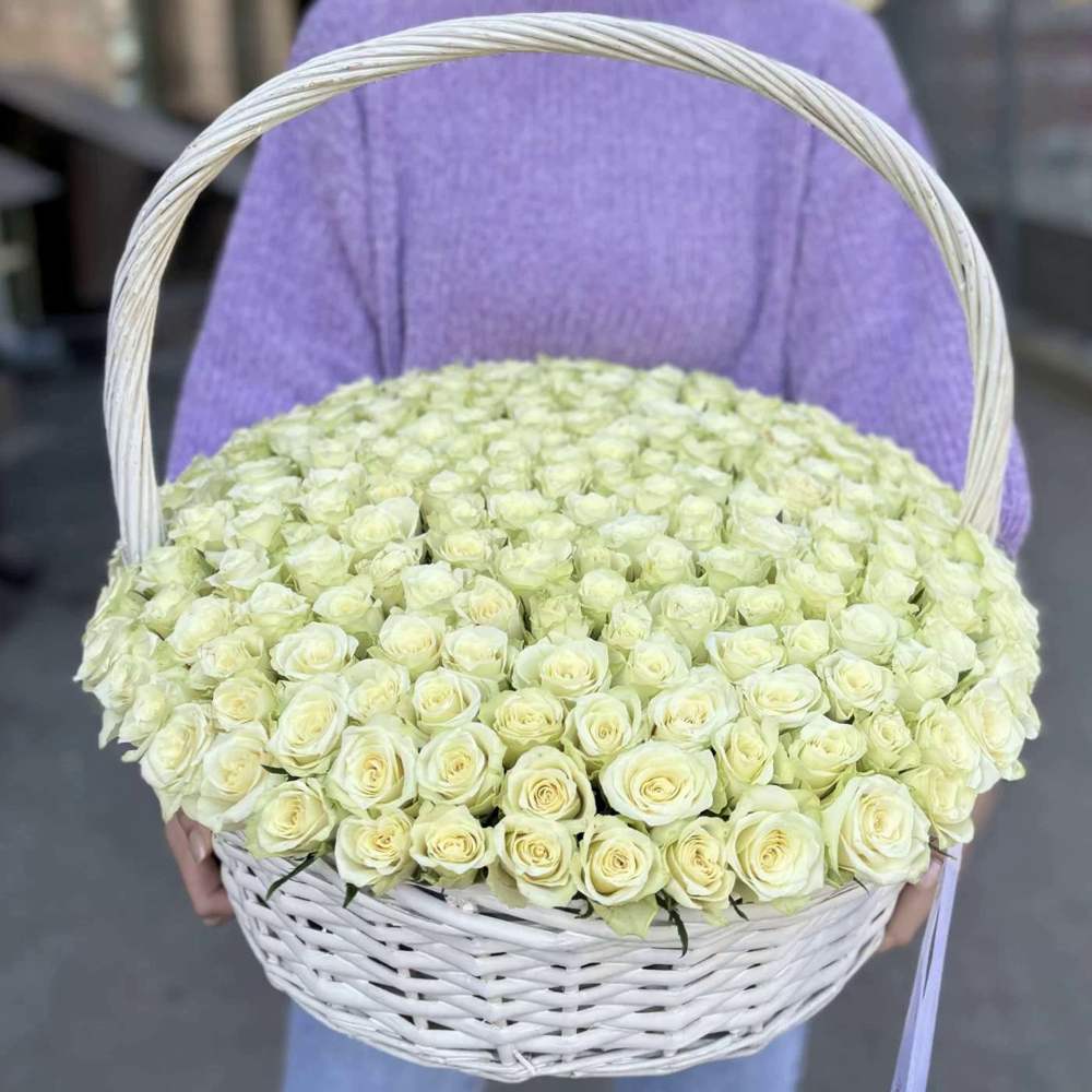 201 белая роза в корзине с лентой