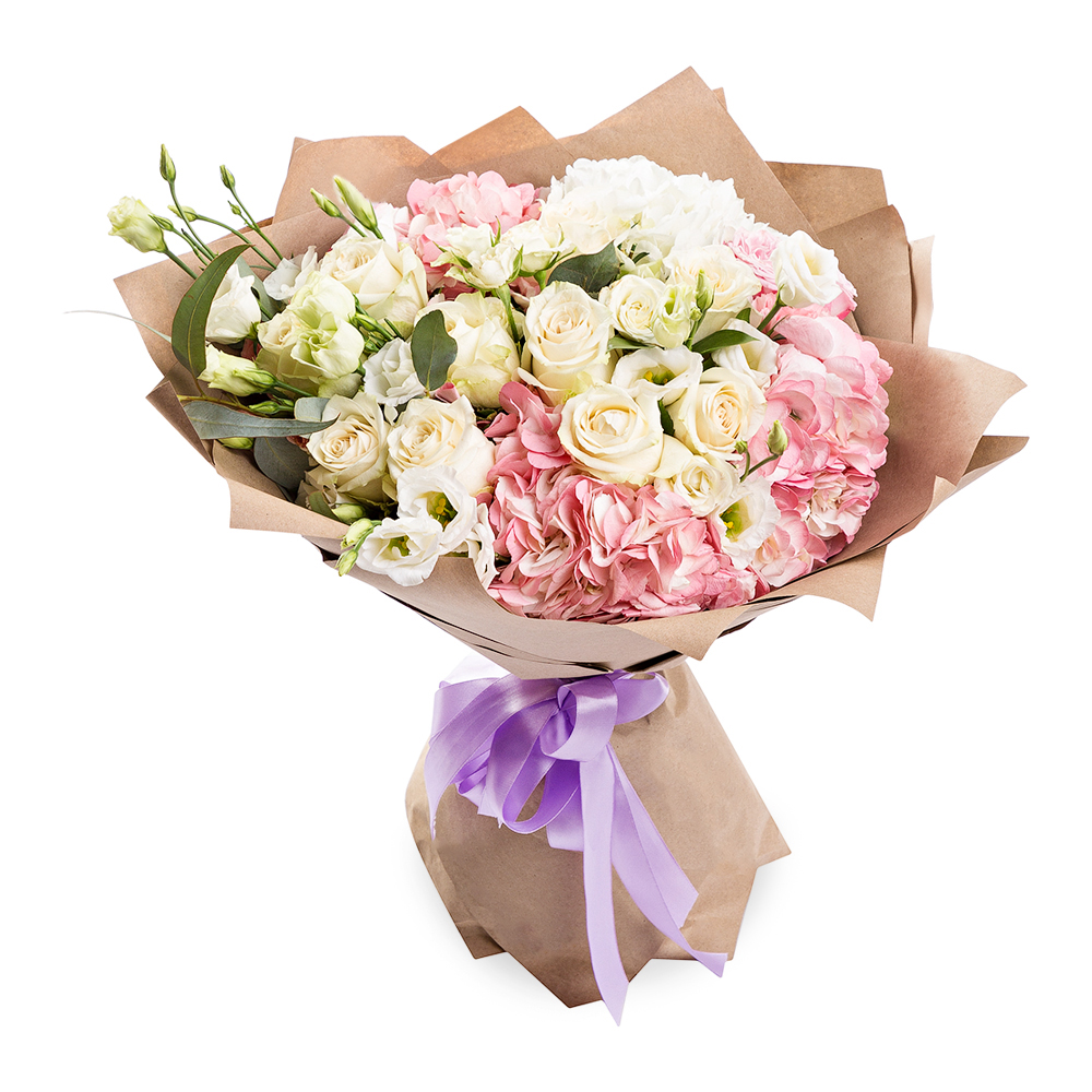 Букет из роз, гвоздик, гортензий и эустом