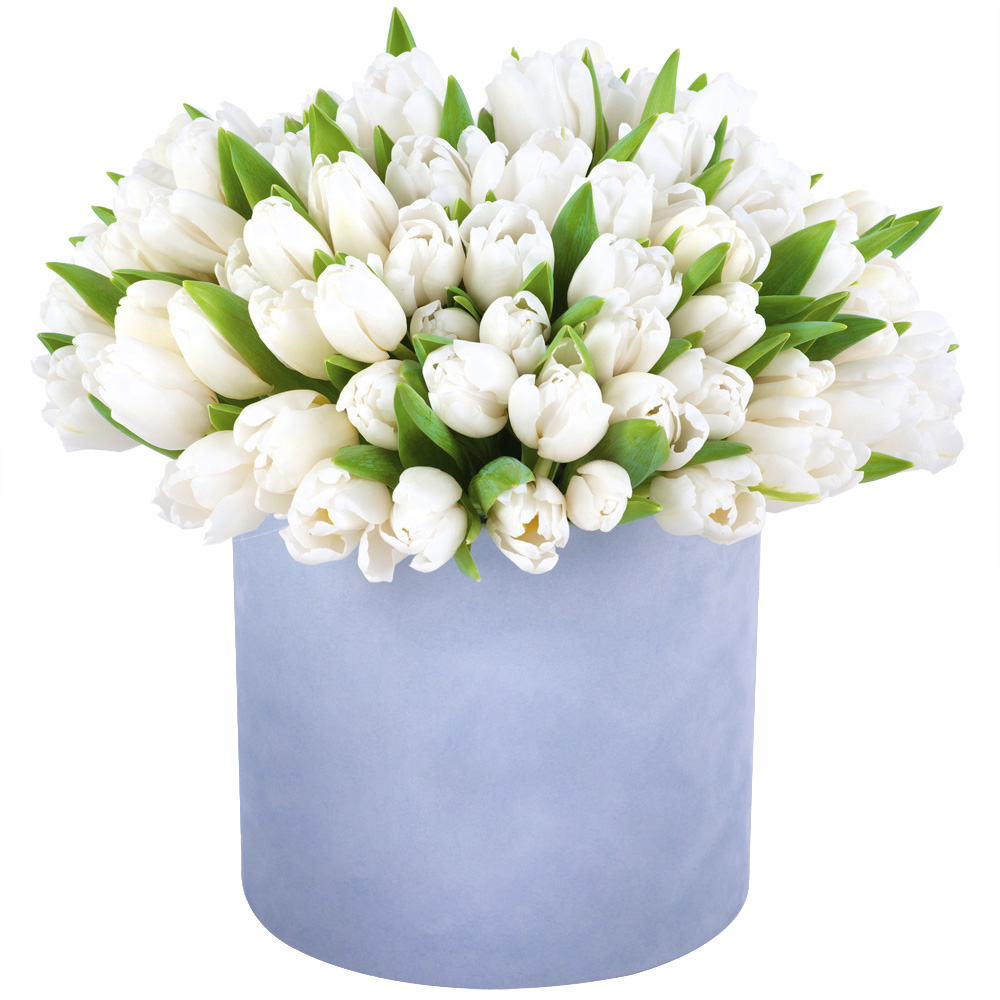 51 белый тюльпан в серой бархатной шляпной коробке