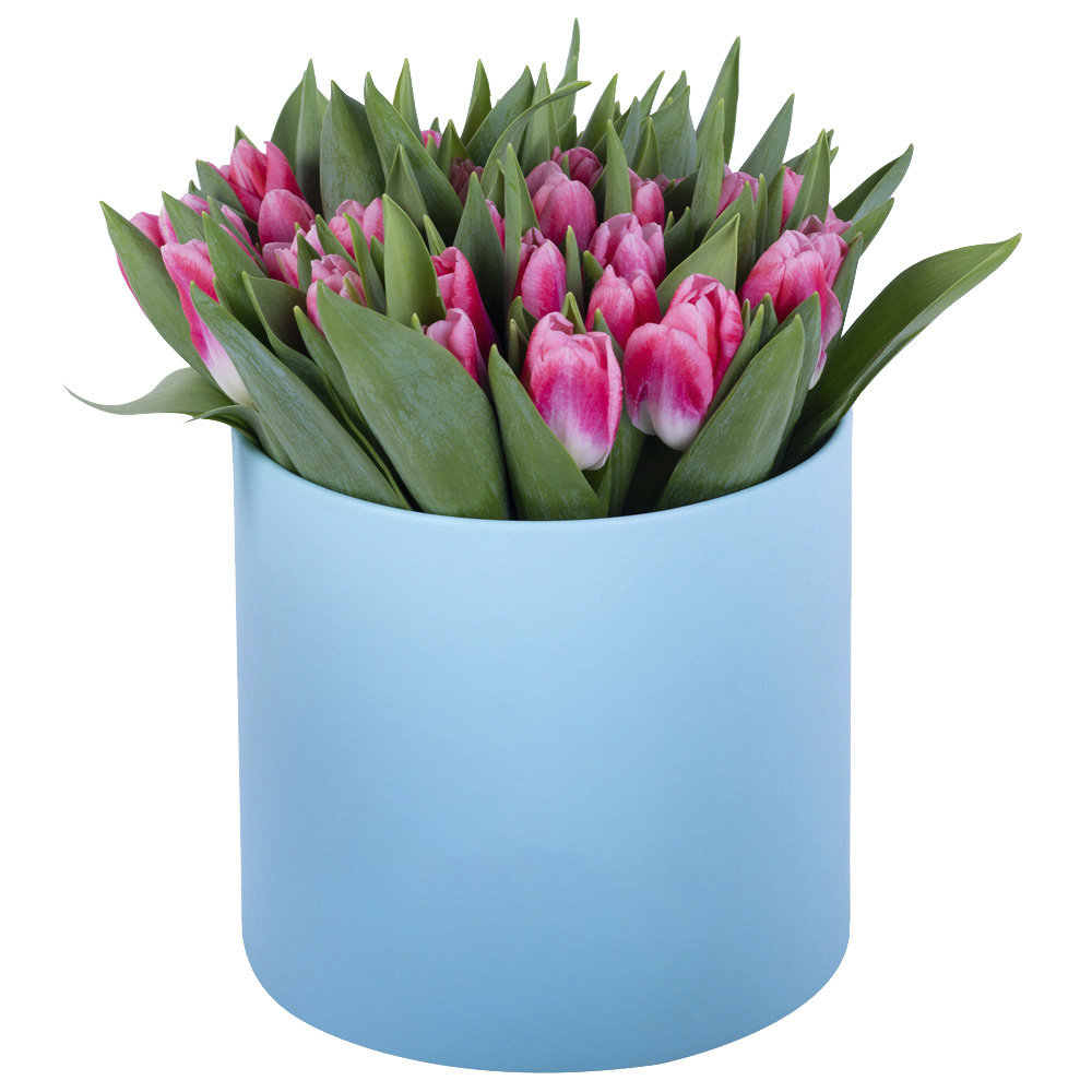 51 Бело-малиновый тюльпан в голубой шляпной коробке