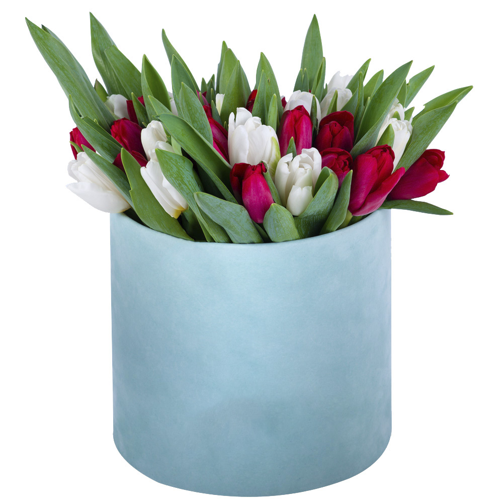 51 Разноцветный тюльпан в зеленой бархатной шляпной коробке