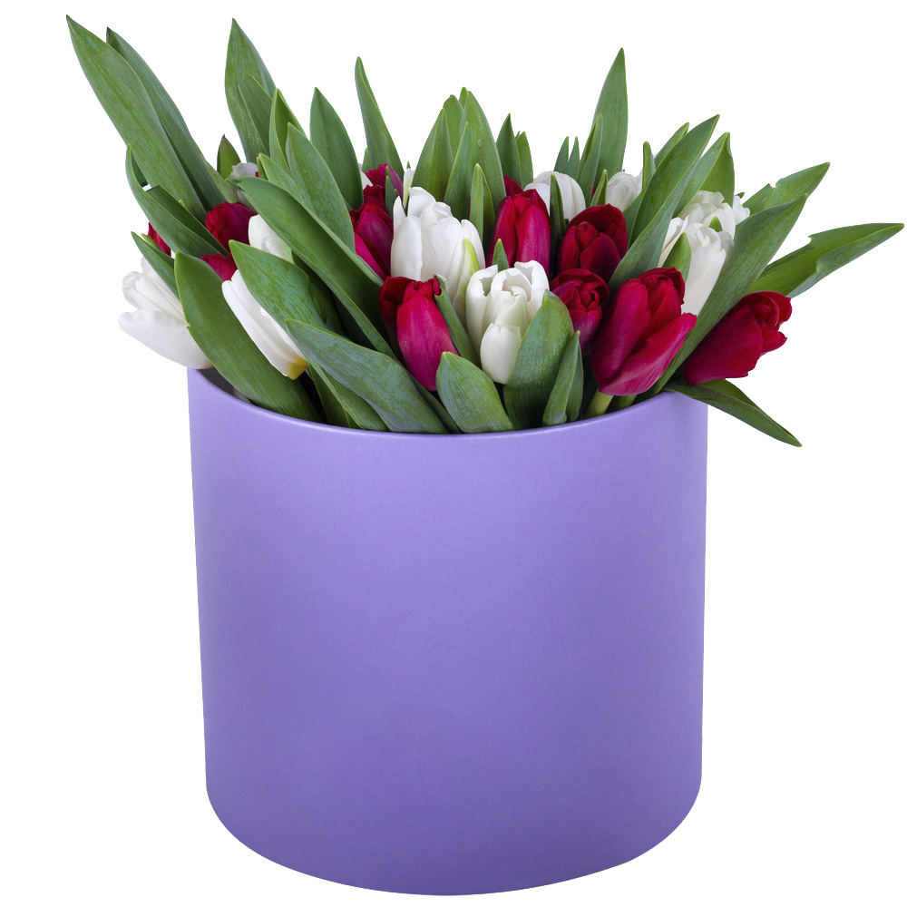 51 Разноцветный тюльпан в фиолетовой шляпной коробке