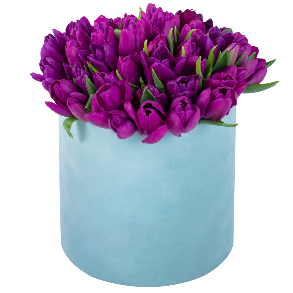 51 фиолетовый тюльпан в зеленой бархатной шляпной коробке