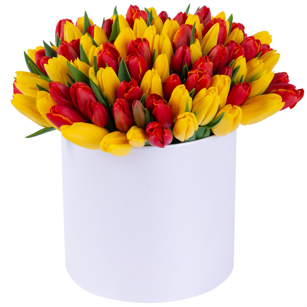 101 микс тюльпанов в белой шляпной коробке